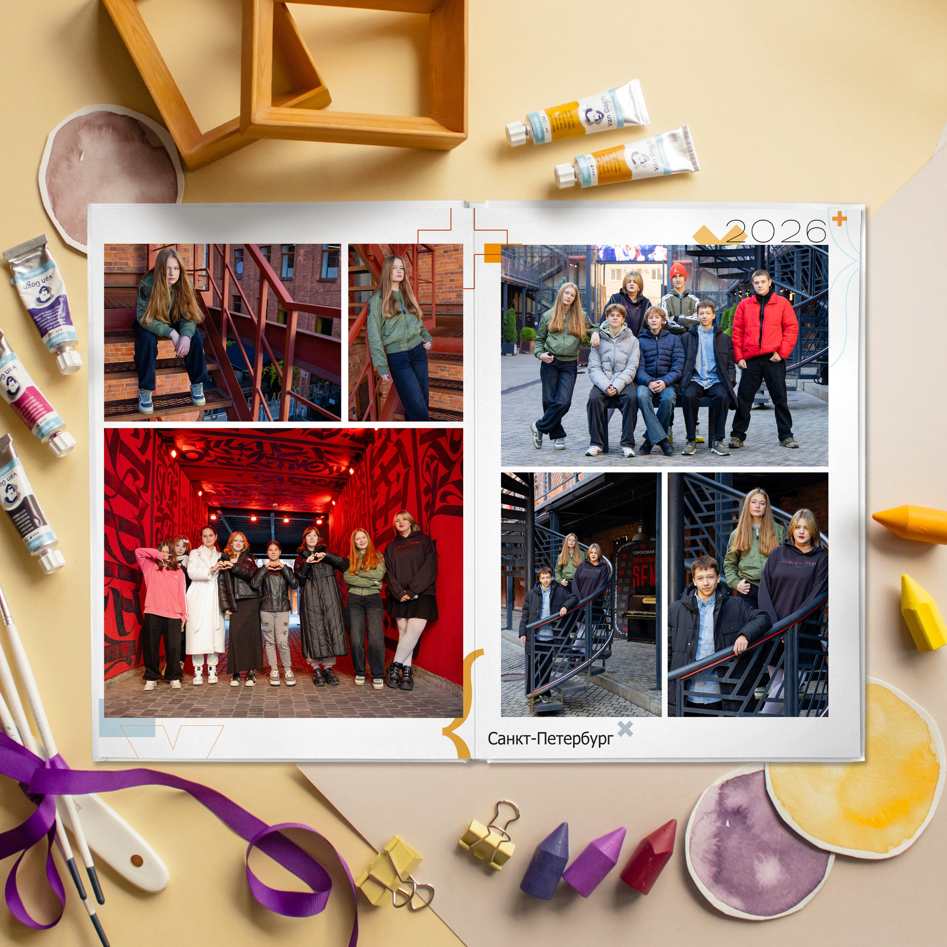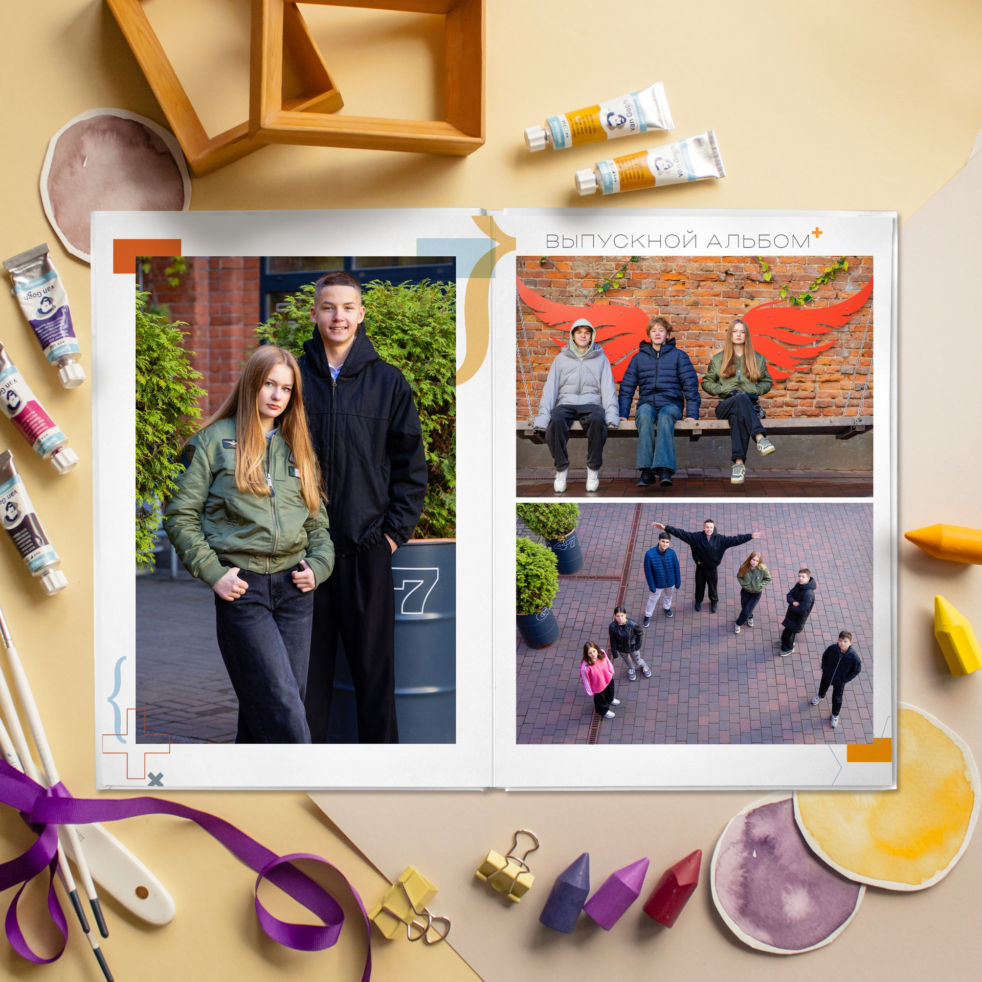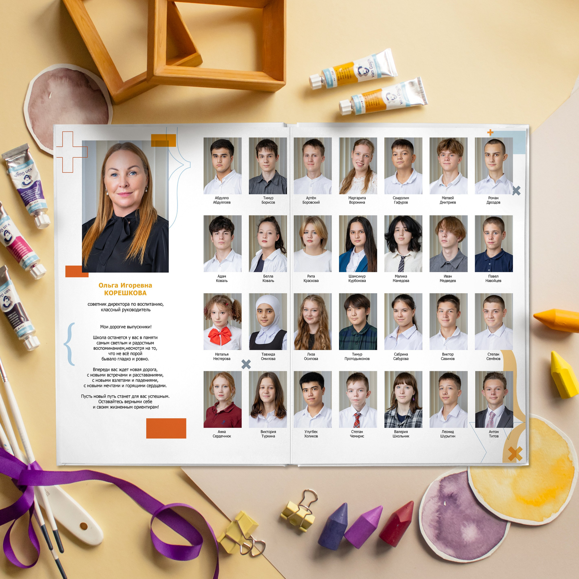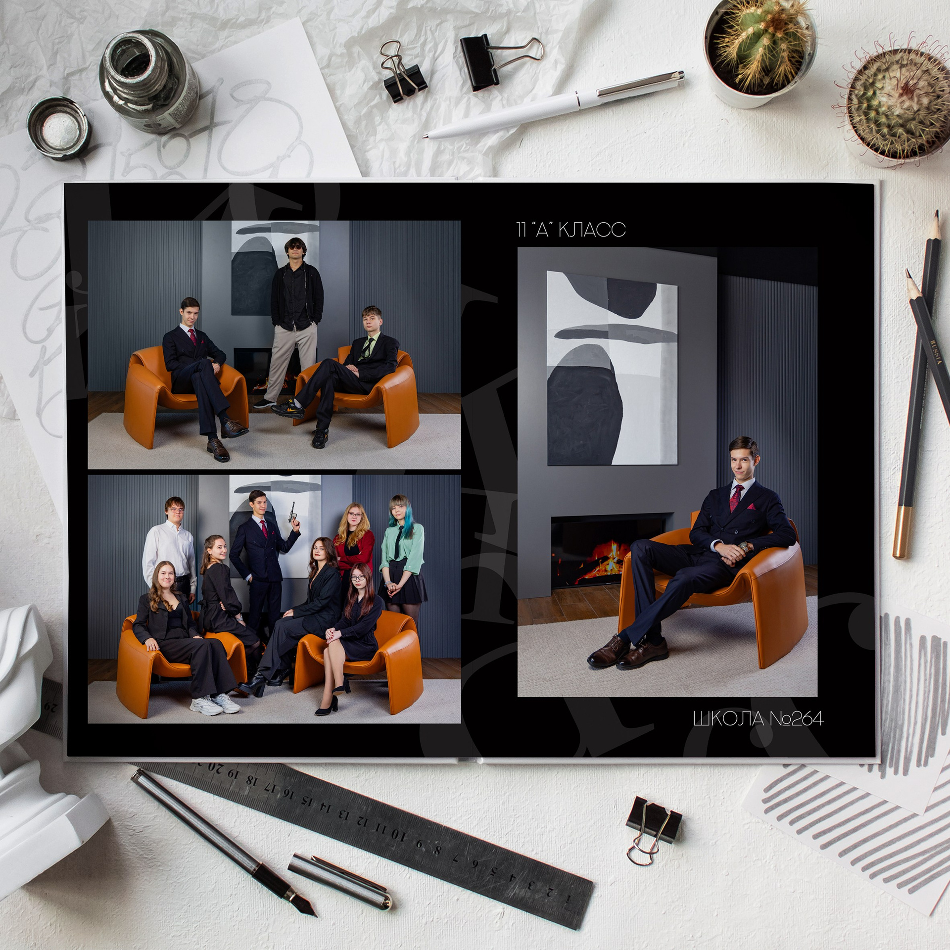 - индивидуальные развороты с цитатами от учеников, родители (ученики) сами отбирают фото в альбом.
